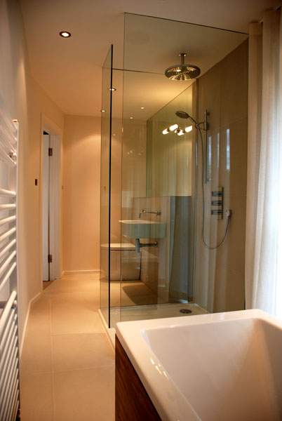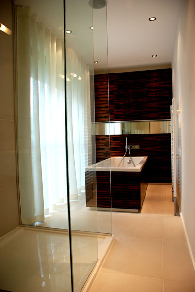 Exotic veneers and billowing drapes assisted in creating this elegant ensuite in Richmond.