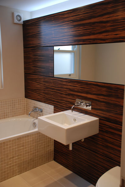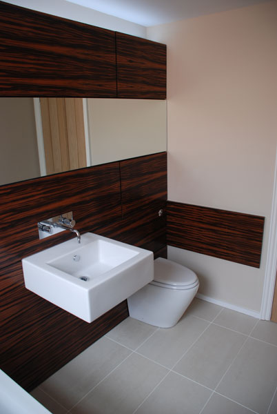 Colour, texture and clever storage added a hint of luxury and fun to these bathrooms in Chiswick.