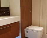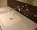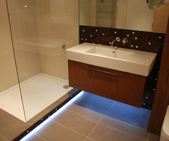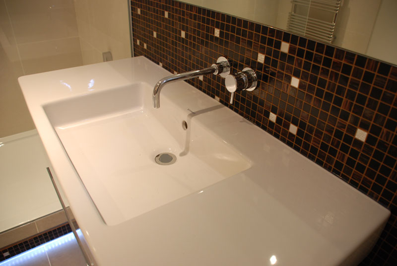Bisazza mosaics and concealed lighting added glamour to this contemporary bathroom in a Docklands apartment.