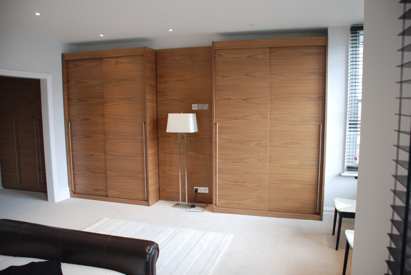 Veneered wardrobes add elegance to this master bedroom in Chiswick.Please contact us with your queries.