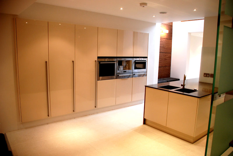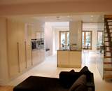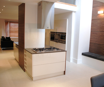 A sense of space and light was achieved with the use of large format, natural tiles and recessed tall units in this Hammersmith town house.