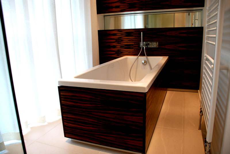 Exotic veneers and billowing drapes assisted in creating this elegant ensuite in Richmond.