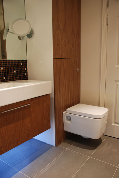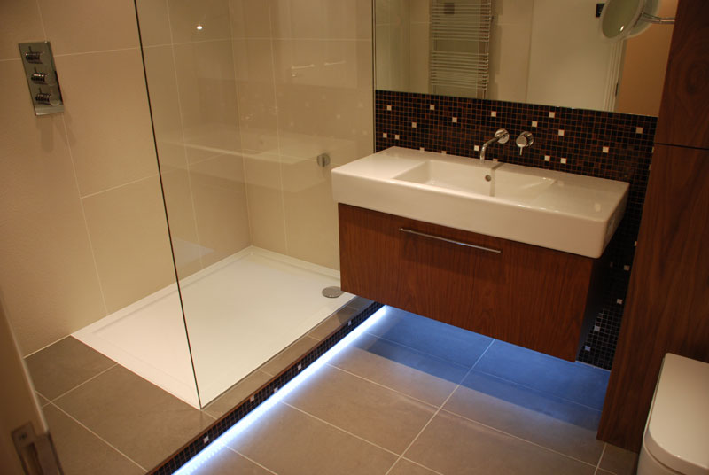 Bisazza mosaics and concealed lighting added glamour to this contemporary bathroom in a Docklands apartment.