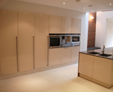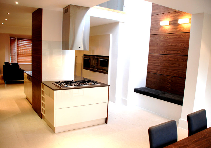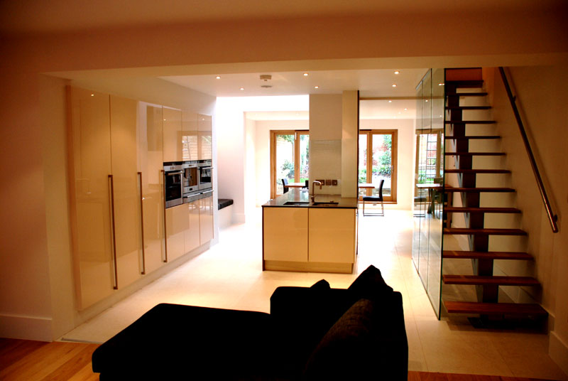 A sense of space and light was achieved with the use of large format, natural tiles and recessed tall units in this Hammersmith town house.
